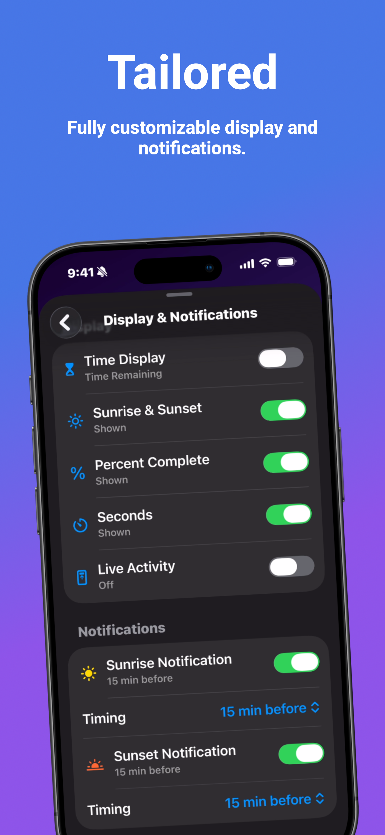 Fine-tune your view by toggling seconds, percent complete, or specific sunrise/sunset times to match your preference.
